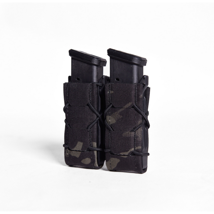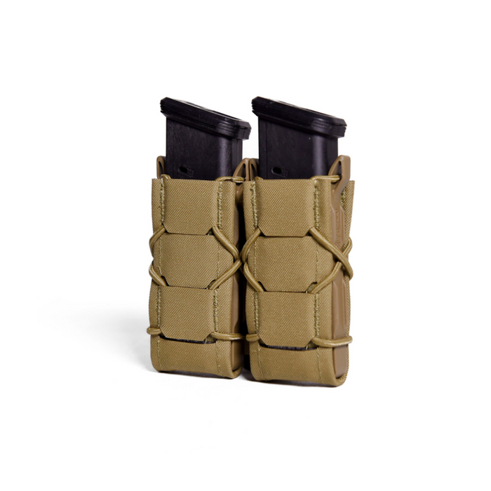 The pouch is specifically designed to hold two pistol magazines or items of similar size, such as flashlights or multitools, ensuring they are quickly accessible.